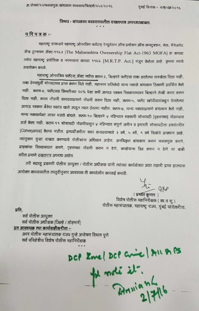 After Prabhat Kumar, the Special Inspector General of Police, issued the circular, several top builders had meetings with officials from the Housing and Home Department at Mantralaya. The builders also met Mr Kumar over getting clarification from him on the circular that was issued. The circular states that complaint should be registered against builders who fail to hand over possession on time to buyers or deliver flats without obtaining occupation certificate (OC). It was further cited that after a delegation of activists had made representation to the police and highlighting various laws under which the police could initiate action against builders.